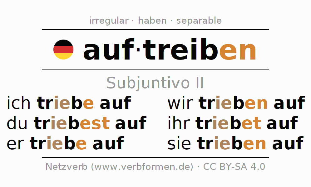 Este verbo auftreiben (conseguir, procurar) se conjuga en subjuntivo II de la siguiente manera: ich triebe auf, du triebest auf, er triebe auf, wir trieben auf, ihr triebet auf, sie trieben auf