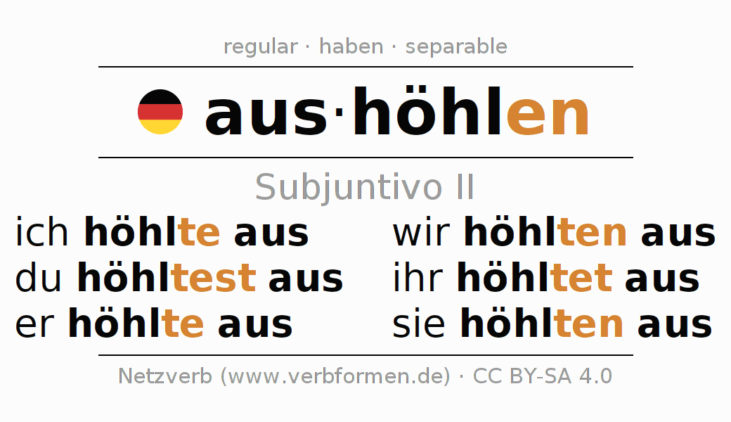 Este verbo aushöhlen (ahuecar, vaciar) se conjuga en subjuntivo II de la siguiente manera: ich höhlte aus, du höhltest aus, er höhlte aus, wir höhlten aus, ihr höhltet aus, sie höhlten aus