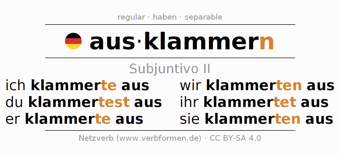 Este verbo ausklammern (excluir, ignorar) se conjuga en subjuntivo II de la siguiente manera: ich klammerte aus, du klammertest aus, er klammerte aus, wir klammerten aus, ihr klammertet aus, sie klammerten aus