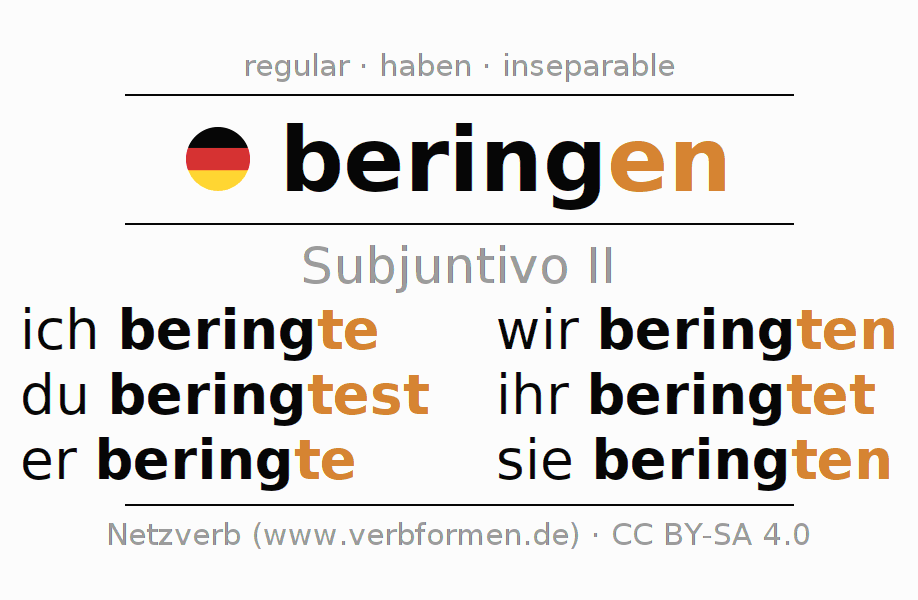 Este verbo beringen (anillar, dotar de anillo) se conjuga en subjuntivo II de la siguiente manera: ich beringte, du beringtest, er beringte, wir beringten, ihr beringtet, sie beringten