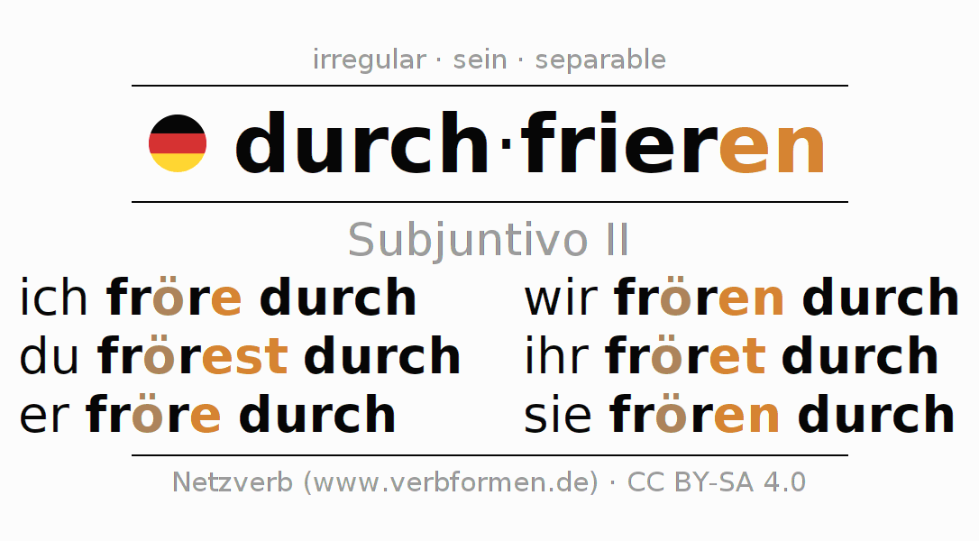 Este verbo durchfrieren (congelar, congelarse) se conjuga en subjuntivo II de la siguiente manera: ich fröre durch, du frörest durch, er fröre durch, wir frören durch, ihr fröret durch, sie frören durch