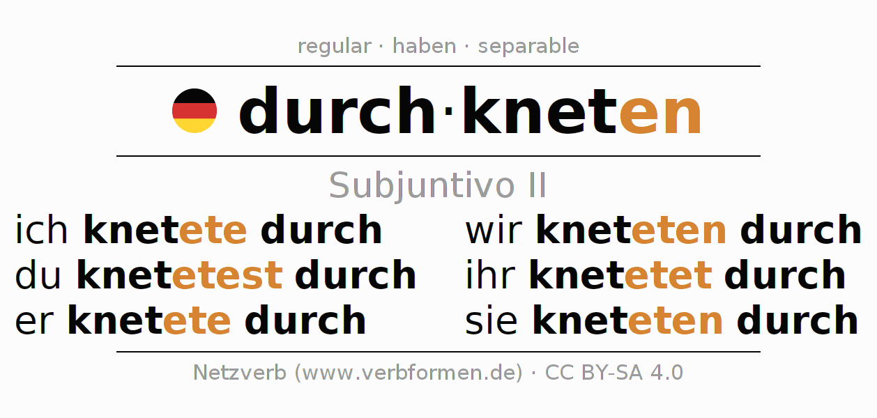 Este verbo durchkneten (amasar, amasar bien) se conjuga en subjuntivo II de la siguiente manera: ich knetete durch, du knetetest durch, er knetete durch, wir kneteten durch, ihr knetetet durch, sie kneteten durch