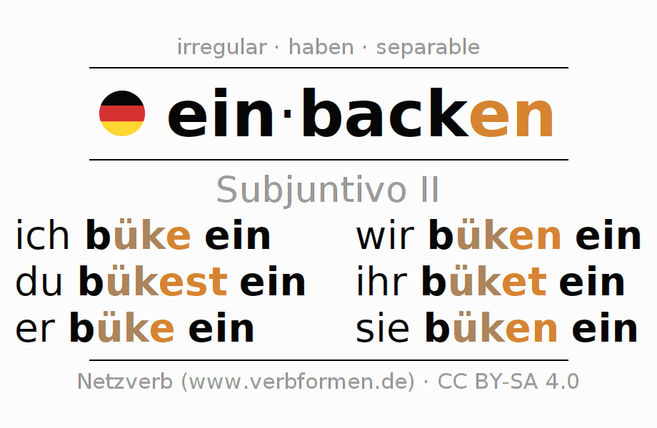 Este verbo einbacken (hornear, incorporar) se conjuga en subjuntivo II de la siguiente manera: ich büke ein, du bükest ein, er büke ein, wir büken ein, ihr büket ein, sie büken ein