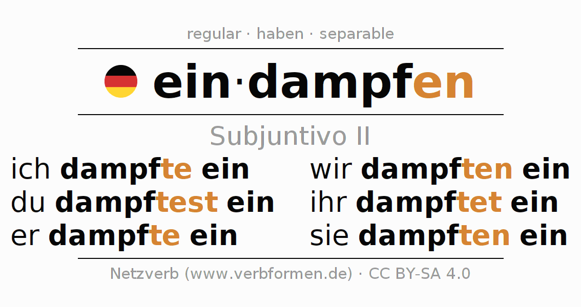 Este verbo eindampfen (concentrar, evaporar) se conjuga en subjuntivo II de la siguiente manera: ich dampfte ein, du dampftest ein, er dampfte ein, wir dampften ein, ihr dampftet ein, sie dampften ein