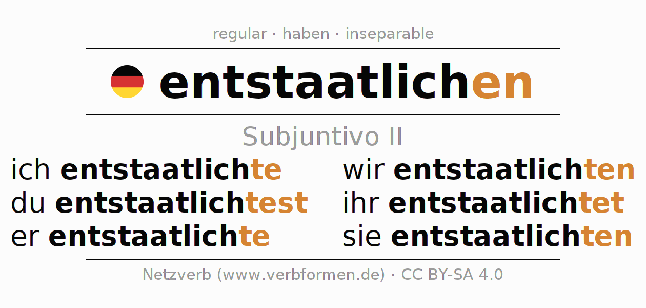 Este verbo entstaatlichen (denacionalizar, privatizar) se conjuga en subjuntivo II de la siguiente manera: ich entstaatlichte, du entstaatlichtest, er entstaatlichte, wir entstaatlichten, ihr entstaatlichtet, sie entstaatlichten
