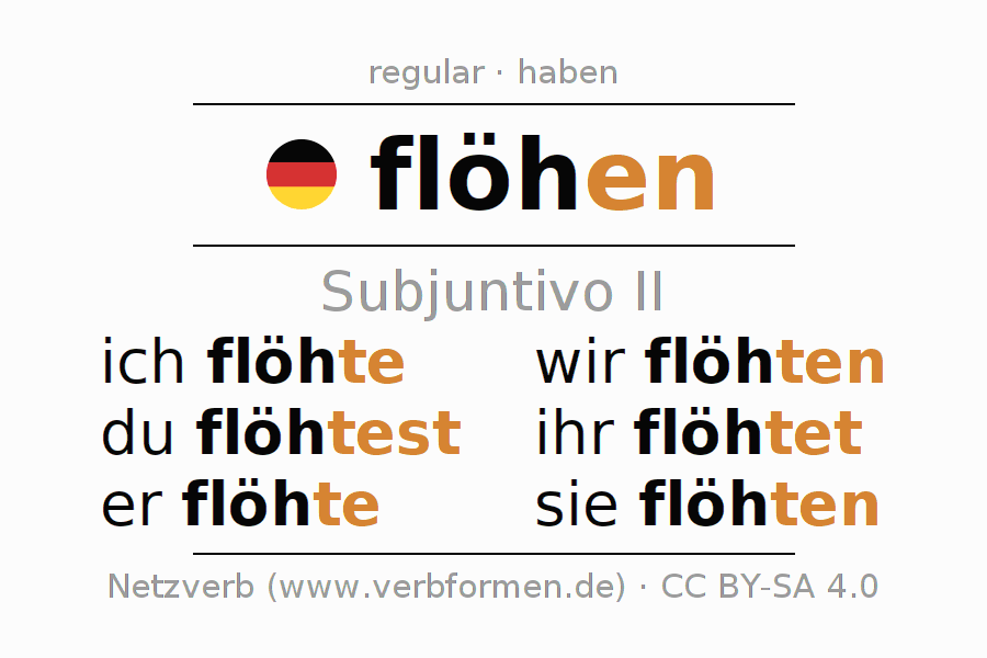 Este verbo flöhen (espulgar, desinfectar) se conjuga en subjuntivo II de la siguiente manera: ich flöhte, du flöhtest, er flöhte, wir flöhten, ihr flöhtet, sie flöhten