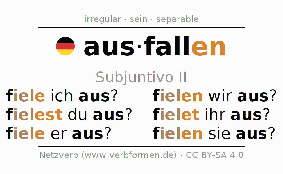 La conjugación de ausfallen en Subjuntivo Pretérito Subjuntivo Activo es fiele ich aus?, fielest du aus?, fiele er aus?, fielen wir aus?, fielet ihr aus?, fielen sie aus?.Para construir esta formas se requiere seguir algunas reglas gramaticales y también las especificaciones para la conjugación de verbos simples de ausfallen en Subjuntivo II . Comentarios ☆