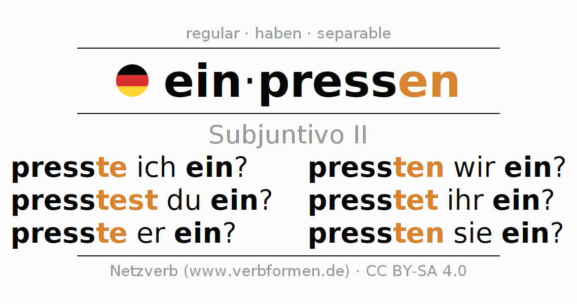 El verbo einpressen, conjugado completamente en todas las personas y números gramaticales en Subjuntivo Pretérito.