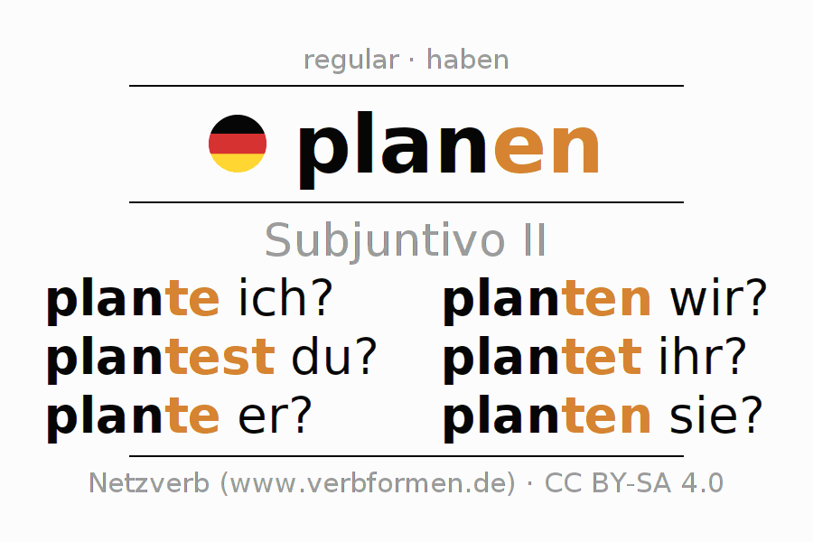 La conjugación de planen en Subjuntivo Pretérito Subjuntivo Activo es plante ich?, plantest du?, plante er?, planten wir?, plantet ihr?, planten sie?.Para construir esta formas se requiere seguir algunas reglas gramaticales y también las especificaciones para la conjugación de verbos simples de planen en Subjuntivo II . Comentarios ☆