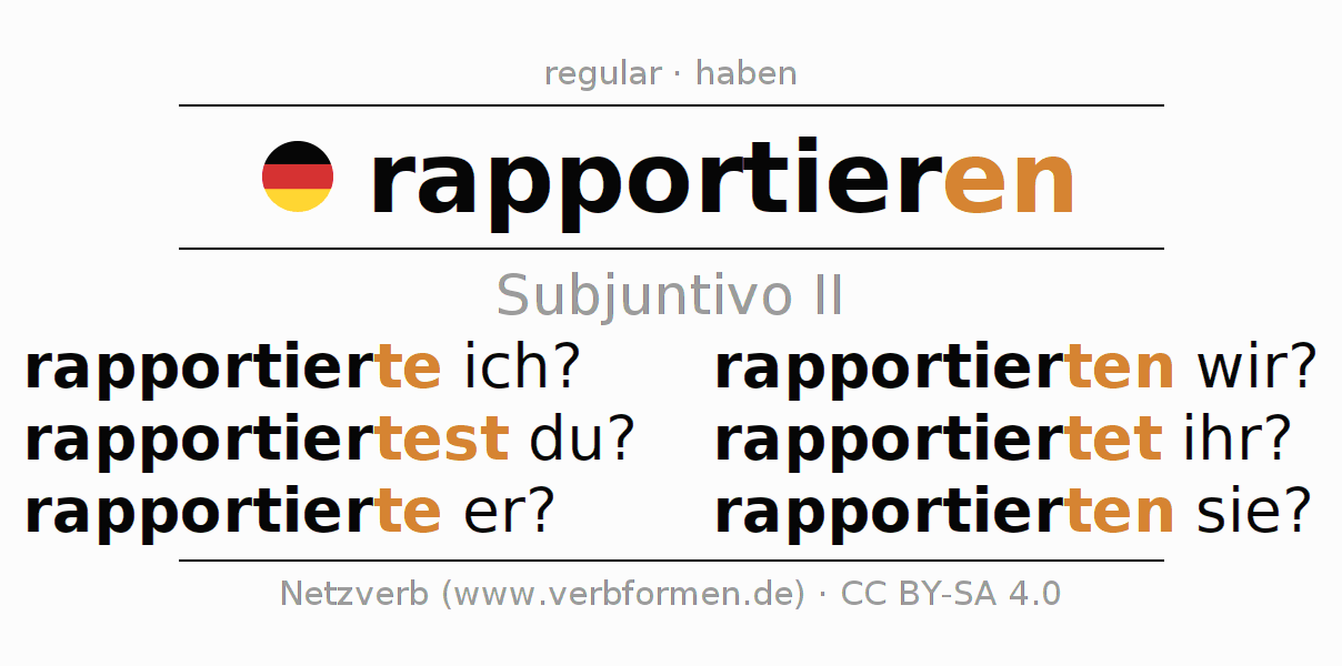 El verbo rapportieren, conjugado completamente en todas las personas y números gramaticales en Subjuntivo Pretérito.