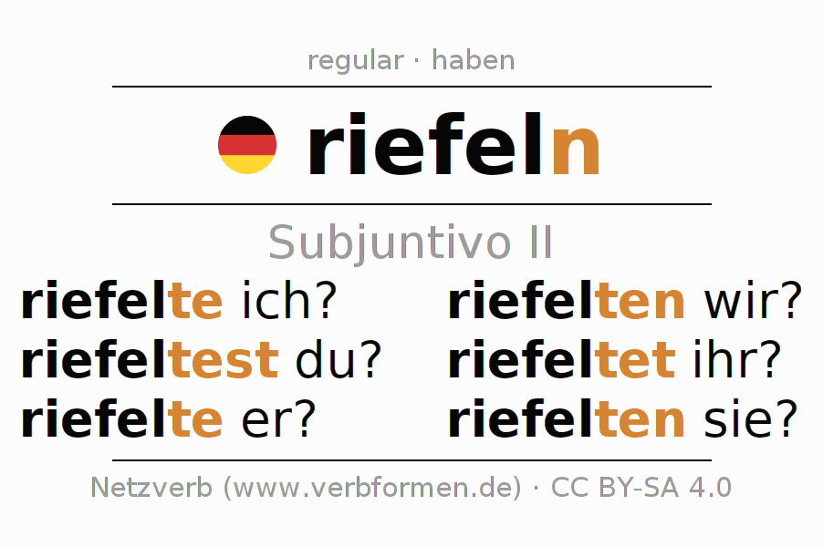El verbo riefeln, conjugado completamente en todas las personas y números gramaticales en Subjuntivo Pretérito.