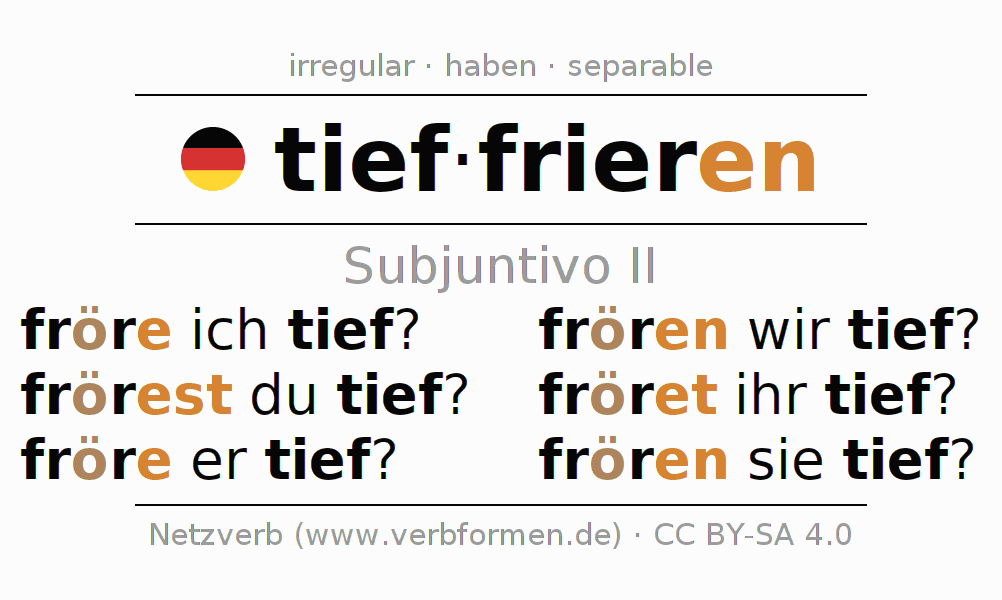 El verbo tieffrieren (hat), conjugado completamente en todas las personas y números gramaticales en Subjuntivo Pretérito.