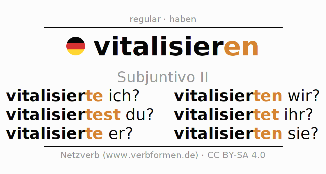 El verbo vitalisieren, conjugado completamente en todas las personas y números gramaticales en Subjuntivo Pretérito.