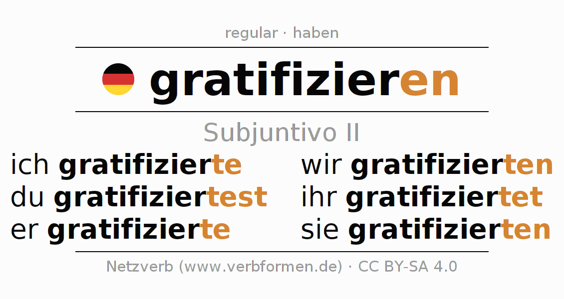Este verbo gratifizieren (compensar, recompensar) se conjuga en subjuntivo II de la siguiente manera: ich gratifizierte, du gratifiziertest, er gratifizierte, wir gratifizierten, ihr gratifiziertet, sie gratifizierten