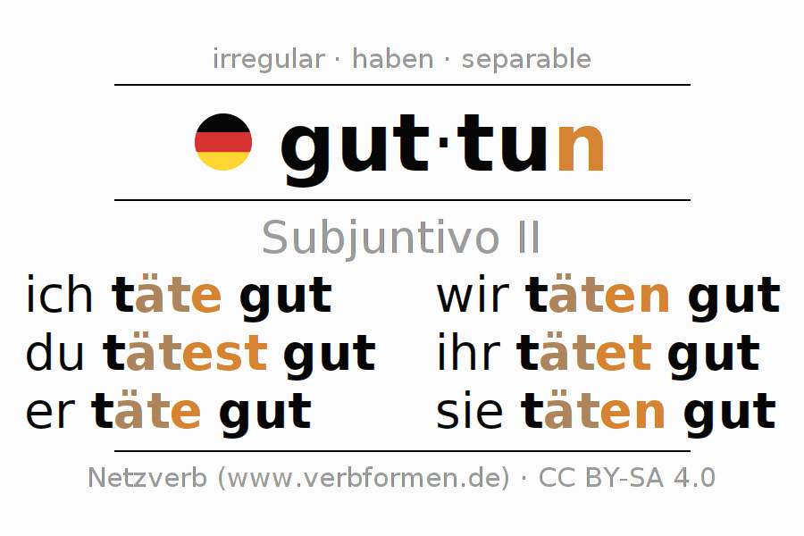 Este verbo guttun (hacer bien, beneficiar) se conjuga en subjuntivo II de la siguiente manera: ich täte gut, du tätest gut, er täte gut, wir täten gut, ihr tätet gut, sie täten gut