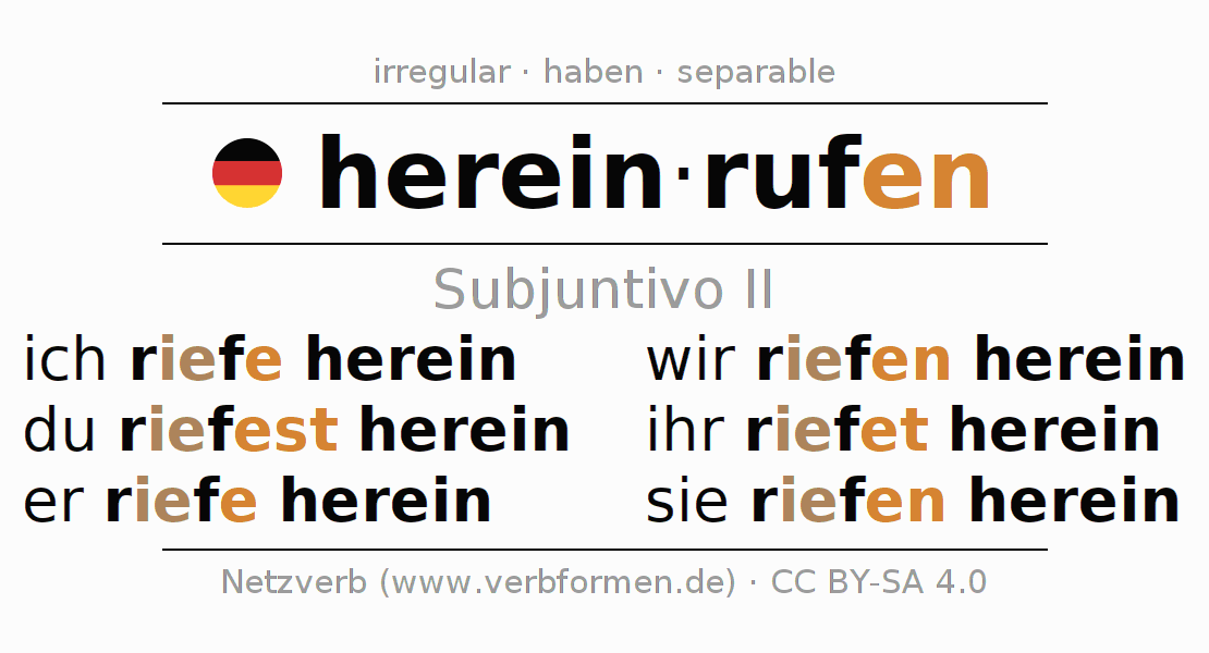 Este verbo hereinrufen (llamar, gritar) se conjuga en subjuntivo II de la siguiente manera: ich riefe herein, du riefest herein, er riefe herein, wir riefen herein, ihr riefet herein, sie riefen herein