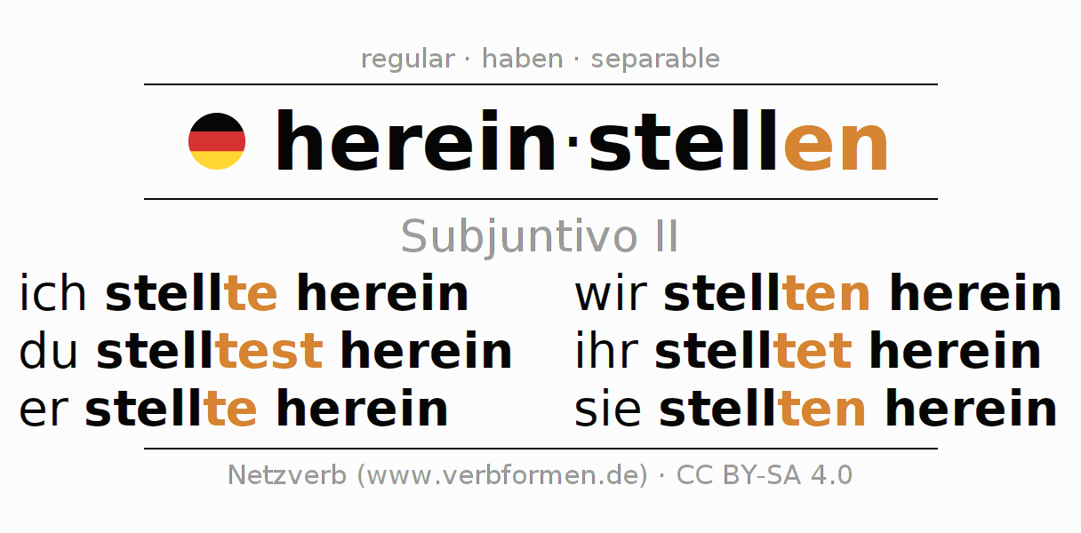 Este verbo hereinstellen (introducir, meter) se conjuga en subjuntivo II de la siguiente manera: ich stellte herein, du stelltest herein, er stellte herein, wir stellten herein, ihr stelltet herein, sie stellten herein