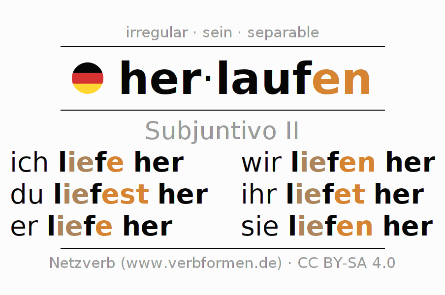 Este verbo herlaufen (pasar, recorrer) se conjuga en subjuntivo II de la siguiente manera: ich liefe her, du liefest her, er liefe her, wir liefen her, ihr liefet her, sie liefen her