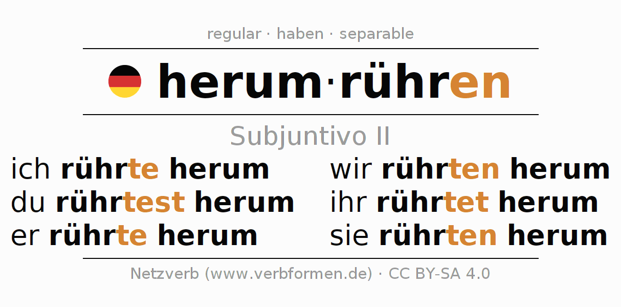 Este verbo herumrühren (remover, mezclar) se conjuga en subjuntivo II de la siguiente manera: ich rührte herum, du rührtest herum, er rührte herum, wir rührten herum, ihr rührtet herum, sie rührten herum