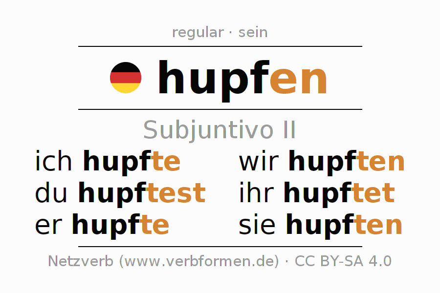 Este verbo hupfen (brincar, saltar) se conjuga en subjuntivo II de la siguiente manera: ich hupfte, du hupftest, er hupfte, wir hupften, ihr hupftet, sie hupften