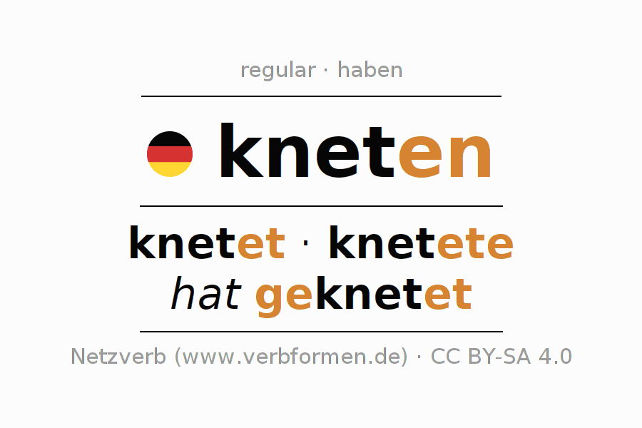 Este verbo kneten (amasar, knead) se conjuga en subjuntivo II de la siguiente manera: ich knetete, du knetetest, er knetete, wir kneteten, ihr knetetet, sie kneteten