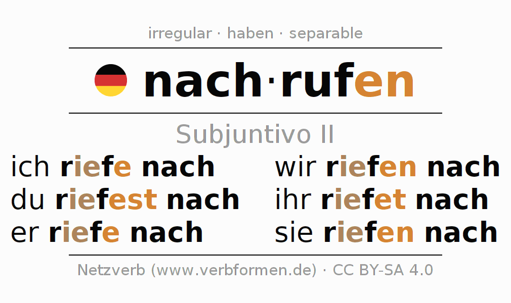 Este verbo nachrufen (gritar, llamar) se conjuga en subjuntivo II de la siguiente manera: ich riefe nach, du riefest nach, er riefe nach, wir riefen nach, ihr riefet nach, sie riefen nach