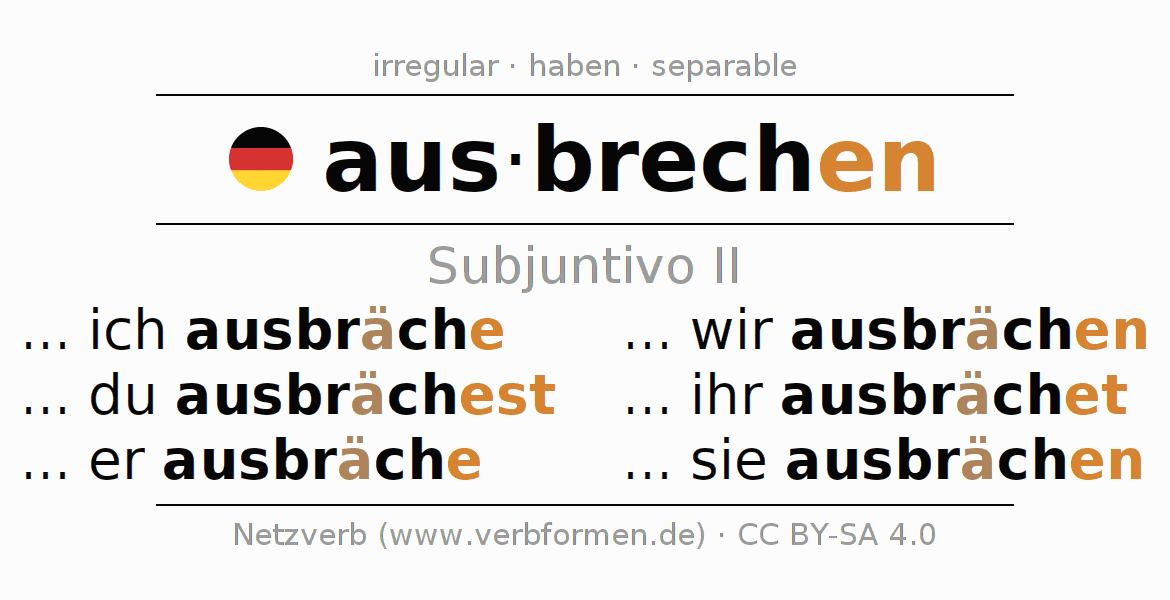 El verbo ausbrechen (hat), conjugado completamente en todas las personas y números gramaticales en Subjuntivo Pretérito.
