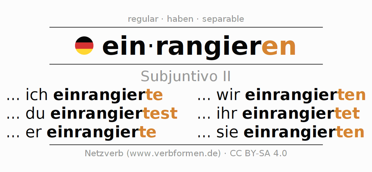 El verbo einrangieren, conjugado completamente en todas las personas y números gramaticales en Subjuntivo Pretérito.