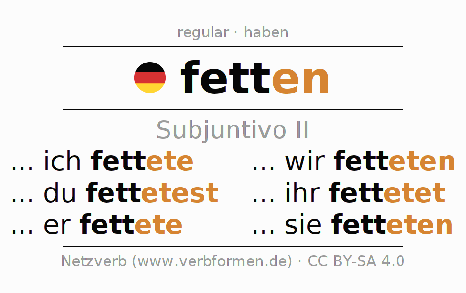 El verbo fetten, conjugado completamente en todas las personas y números gramaticales en Subjuntivo Pretérito.