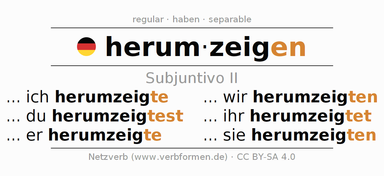 El verbo herumzeigen, conjugado completamente en todas las personas y números gramaticales en Subjuntivo Pretérito.