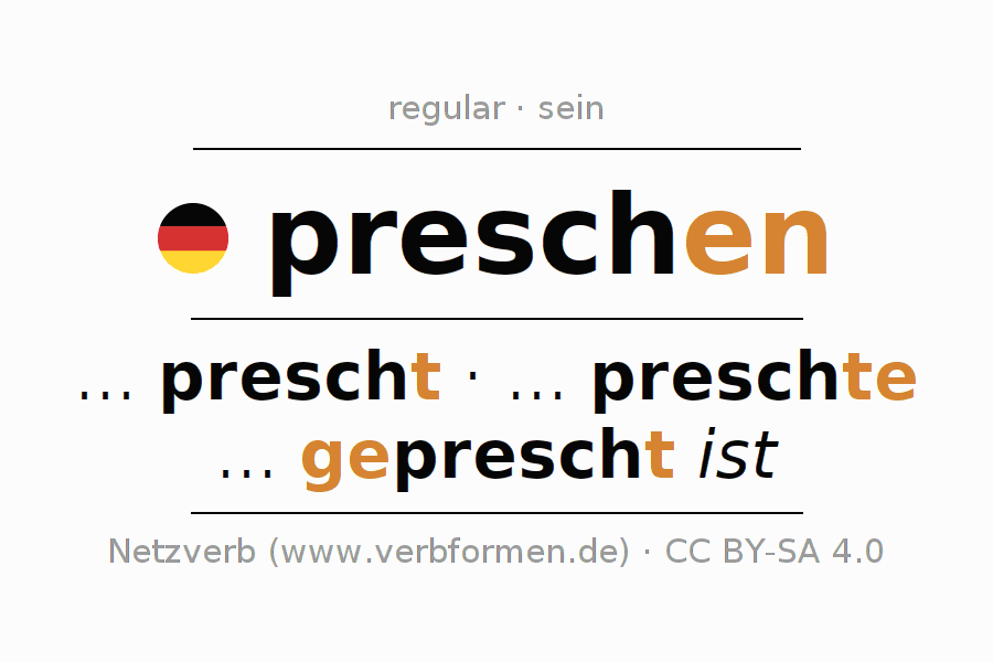 La conjugación de preschen en Subjuntivo Pretérito Subjuntivo Activo es ... ich preschte, ... du preschtest, ... er preschte, ... wir preschten, ... ihr preschtet, ... sie preschten.Para construir esta formas se requiere seguir algunas reglas gramaticales y también las especificaciones para la conjugación de verbos simples de preschen en Subjuntivo II . Comentarios ☆