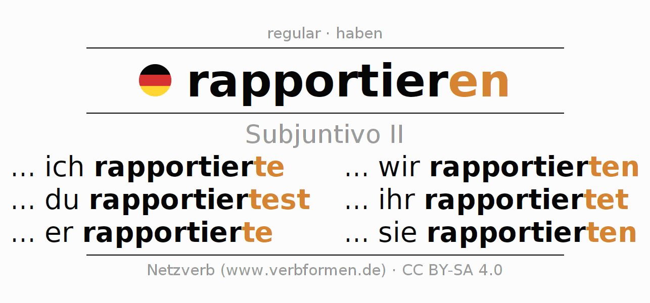 El verbo rapportieren, conjugado completamente en todas las personas y números gramaticales en Subjuntivo Pretérito.