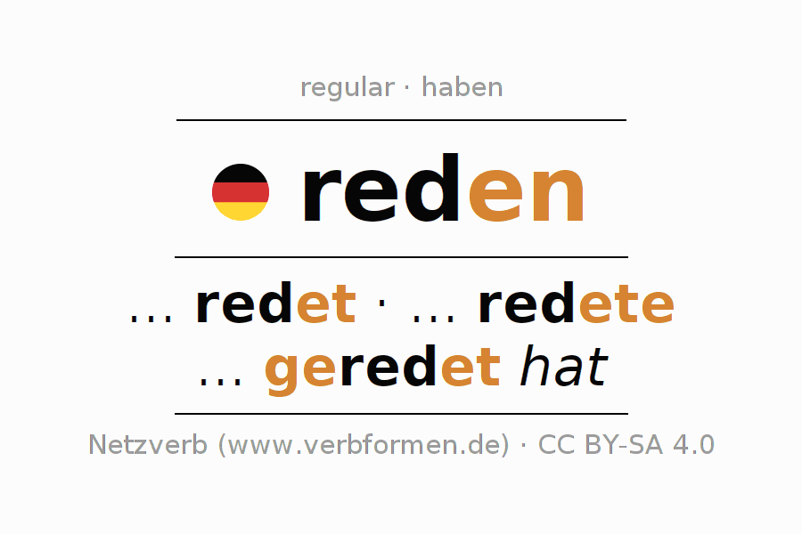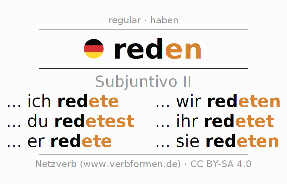 La conjugación de reden en Subjuntivo Pretérito Subjuntivo Activo es ... ich redete, ... du redetest, ... er redete, ... wir redeten, ... ihr redetet, ... sie redeten.Para construir esta formas se requiere seguir algunas reglas gramaticales y también las especificaciones para la conjugación de verbos simples de reden en Subjuntivo II . Comentarios ☆