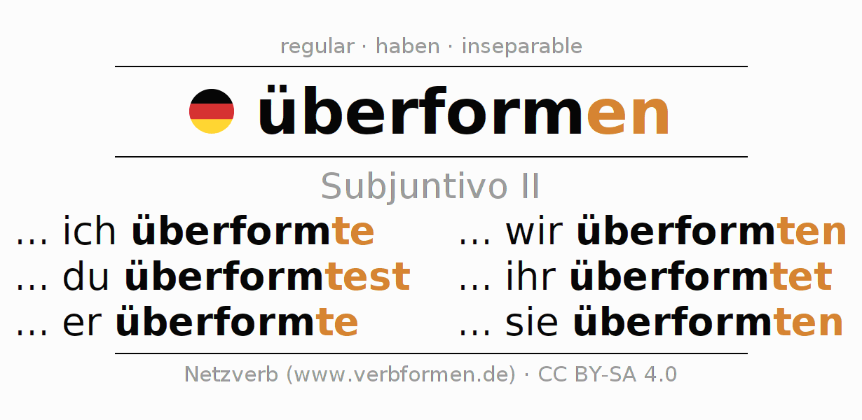El verbo überformen, conjugado completamente en todas las personas y números gramaticales en Subjuntivo Pretérito.