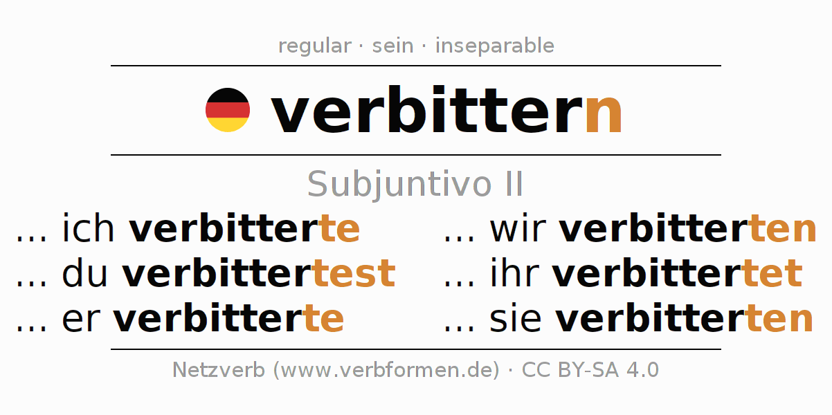 El verbo verbittern (ist), conjugado completamente en todas las personas y números gramaticales en Subjuntivo Pretérito.