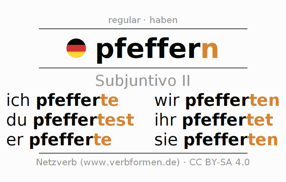 Este verbo pfeffern (arrojar, echar pimienta) se conjuga en subjuntivo II de la siguiente manera: ich pfefferte, du pfeffertest, er pfefferte, wir pfefferten, ihr pfeffertet, sie pfefferten