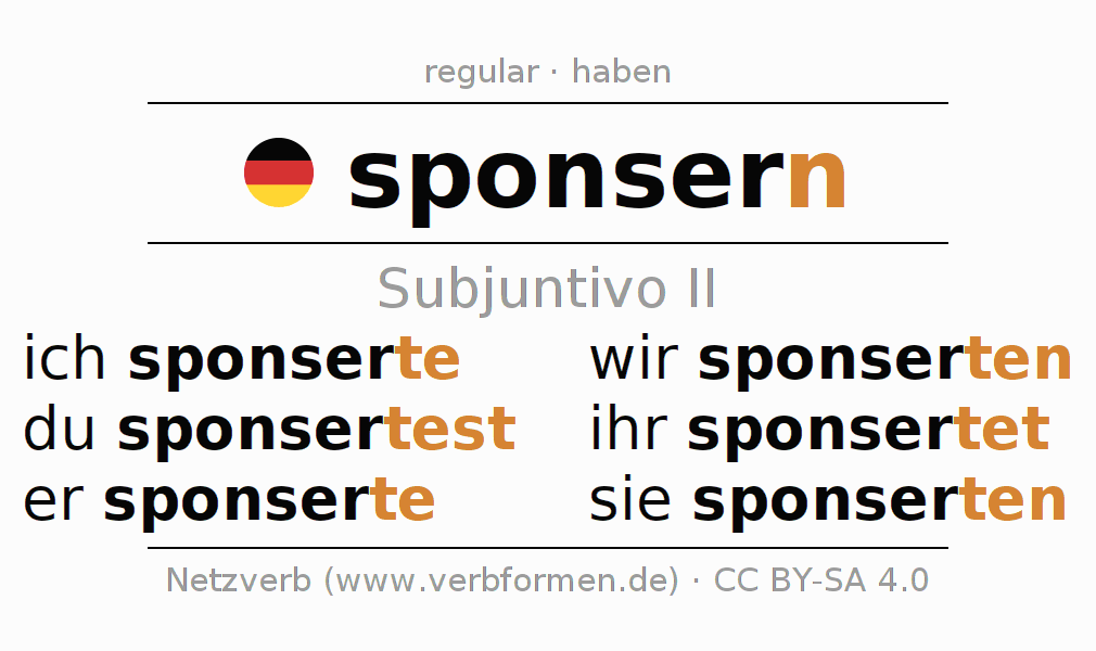 Este verbo sponsern (patrocinar, apoyar) se conjuga en subjuntivo II de la siguiente manera: ich sponserte, du sponsertest, er sponserte, wir sponserten, ihr sponsertet, sie sponserten