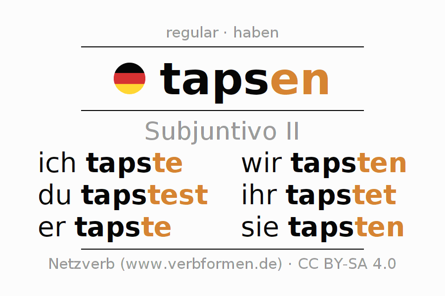 Este verbo tapsen (tambalear, tropiezo) se conjuga en subjuntivo II de la siguiente manera: ich tapste, du tapstest, er tapste, wir tapsten, ihr tapstet, sie tapsten