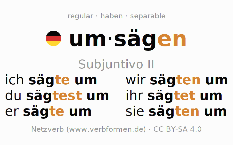 Este verbo umsägen (cortar, talar) se conjuga en subjuntivo II de la siguiente manera: ich sägte um, du sägtest um, er sägte um, wir sägten um, ihr sägtet um, sie sägten um