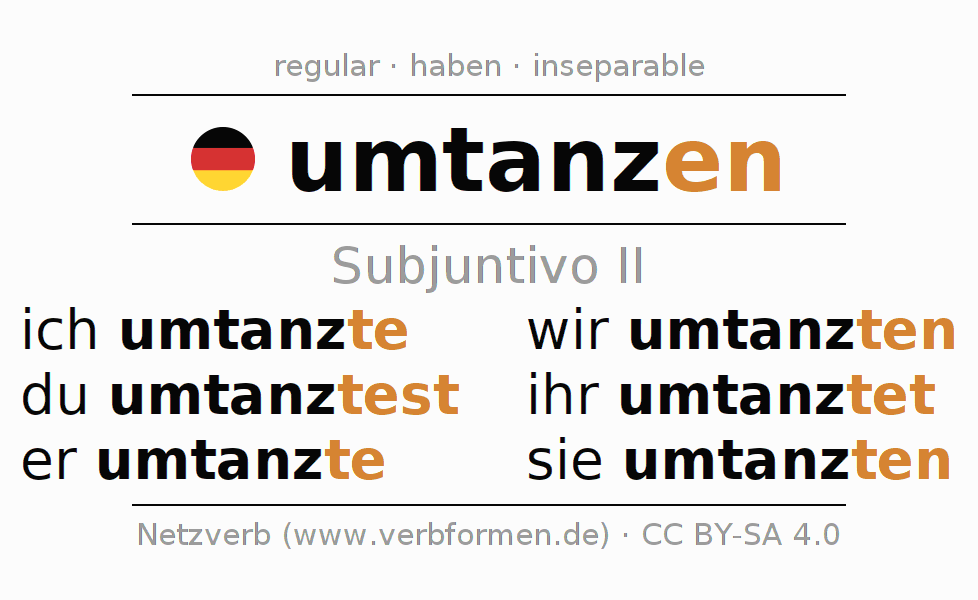 Este verbo umtanzen (bailar alrededor) se conjuga en subjuntivo II de la siguiente manera: ich umtanzte, du umtanztest, er umtanzte, wir umtanzten, ihr umtanztet, sie umtanzten