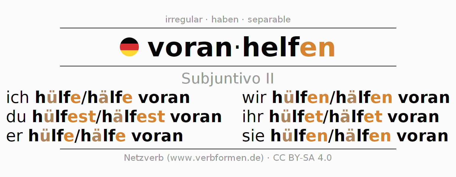Este verbo voranhelfen (apoyar, ayudar) se conjuga en subjuntivo II de la siguiente manera: ich hülfe/hälfe voran, du hülfest/hälfest voran, er hülfe/hälfe voran, wir hülfen/hälfen voran, ihr hülfet/hälfet voran, sie hülfen/hälfen voran