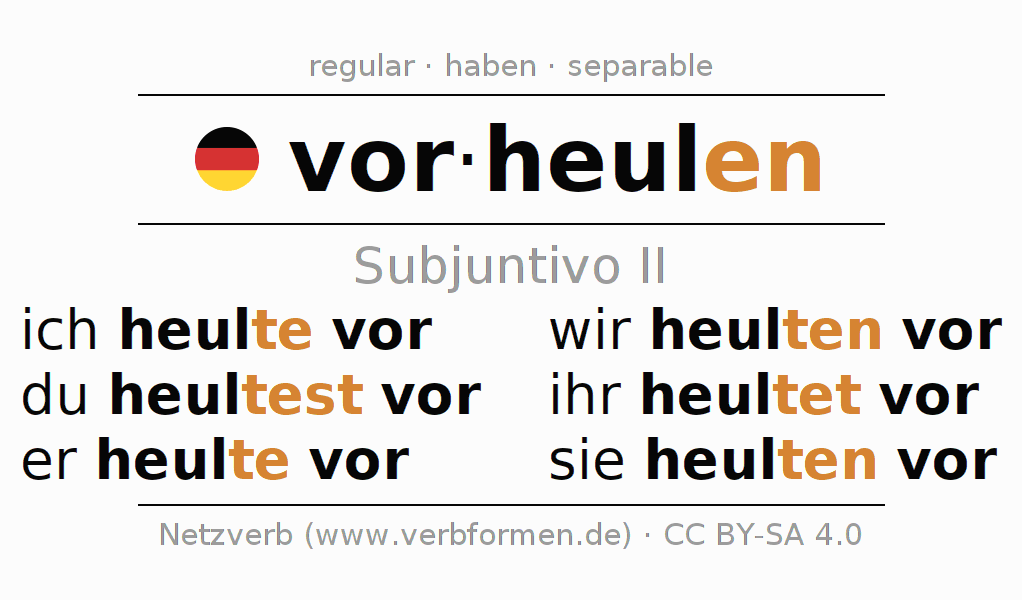 Este verbo vorheulen (llorar, quejarse) se conjuga en subjuntivo II de la siguiente manera: ich heulte vor, du heultest vor, er heulte vor, wir heulten vor, ihr heultet vor, sie heulten vor