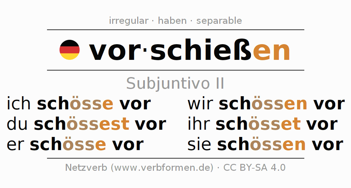 Este verbo vorschießen (adelantar, anticipar) se conjuga en subjuntivo II de la siguiente manera: ich schösse vor, du schössest vor, er schösse vor, wir schössen vor, ihr schösset vor, sie schössen vor