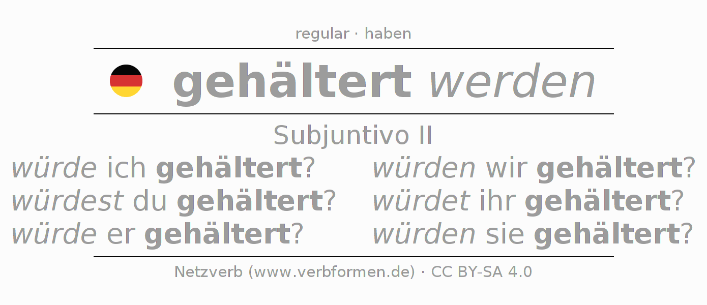 La conjugación de hältern en Subjuntivo Pretérito Subjuntivo Pasivo procesivo es würde ich gehältert?, würdest du gehältert?, würde er gehältert?, würden wir gehältert?, würdet ihr gehältert?, würden sie gehältert?.Para construir esta formas se requiere seguir algunas reglas gramaticales y también las especificaciones para la conjugación de verbos simples de hältern en Subjuntivo II . Comentarios ☆