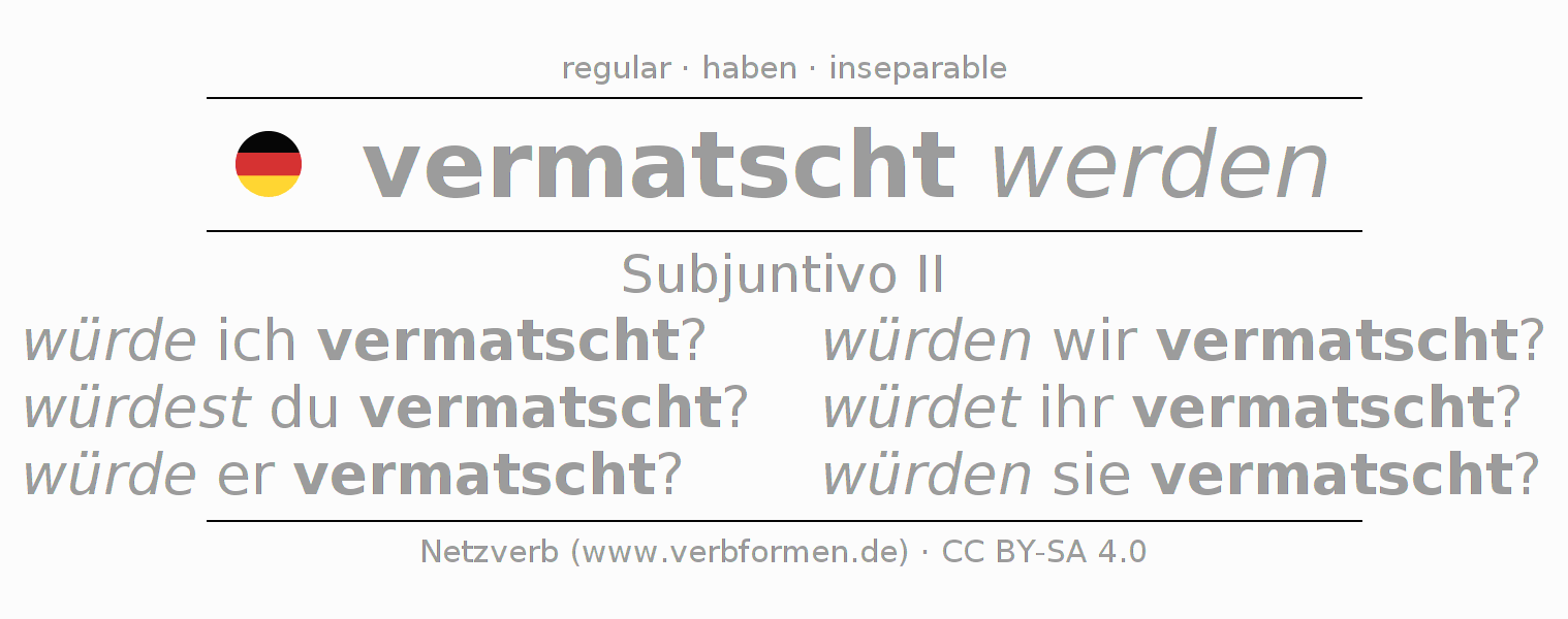 La conjugación de vermatschen en Subjuntivo Pretérito Subjuntivo Pasivo procesivo es würde ich vermatscht?, würdest du vermatscht?, würde er vermatscht?, würden wir vermatscht?, würdet ihr vermatscht?, würden sie vermatscht?.Para construir esta formas se requiere seguir algunas reglas gramaticales y también las especificaciones para la conjugación de verbos simples de vermatschen en Subjuntivo II . Comentarios ☆