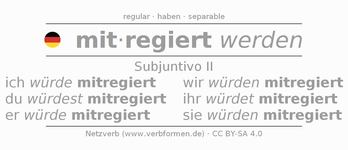 La conjugación de mitregieren en Subjuntivo Pretérito Subjuntivo Pasivo procesivo es ich würde mitregiert, du würdest mitregiert, er würde mitregiert, wir würden mitregiert, ihr würdet mitregiert, sie würden mitregiert.Para construir esta formas se requiere seguir algunas reglas gramaticales y también las especificaciones para la conjugación de verbos simples de mitregieren en Subjuntivo II . Comentarios ☆