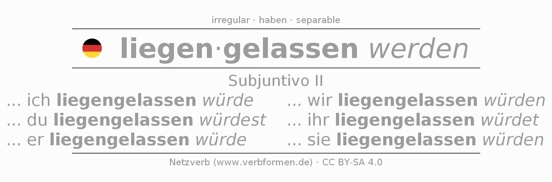 El verbo liegenlassen, conjugado completamente en todas las personas y números gramaticales en Subjuntivo Pretérito.