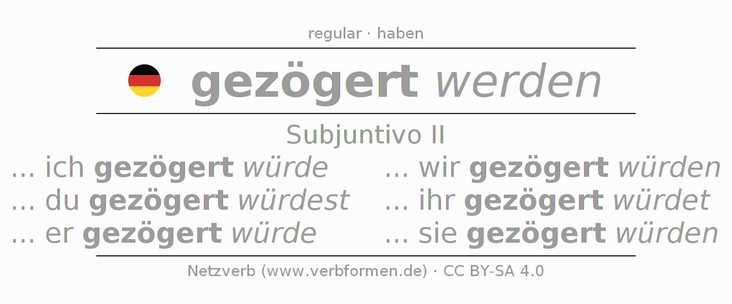 La conjugación de zögern en Subjuntivo Pretérito Subjuntivo Pasivo procesivo es ... ich gezögert würde, ... du gezögert würdest, ... er gezögert würde, ... wir gezögert würden, ... ihr gezögert würdet, ... sie gezögert würden.Para construir esta formas se requiere seguir algunas reglas gramaticales y también las especificaciones para la conjugación de verbos simples de zögern en Subjuntivo II . Comentarios ☆