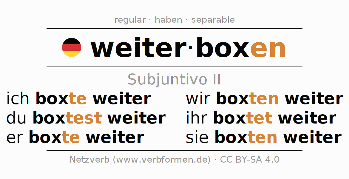Este verbo weiterboxen (continuar boxeando, seguir boxeando) se conjuga en subjuntivo II de la siguiente manera: ich boxte weiter, du boxtest weiter, er boxte weiter, wir boxten weiter, ihr boxtet weiter, sie boxten weiter