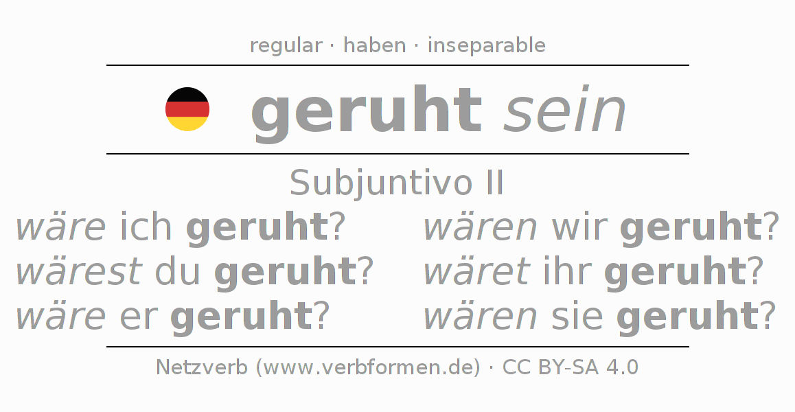 La conjugación de geruhen en Subjuntivo Pretérito Subjuntivo Pasivo situativo es wäre ich geruht?, wärest du geruht?, wäre er geruht?, wären wir geruht?, wäret ihr geruht?, wären sie geruht?.Para construir esta formas se requiere seguir algunas reglas gramaticales y también las especificaciones para la conjugación de verbos simples de geruhen en Subjuntivo II . Comentarios ☆